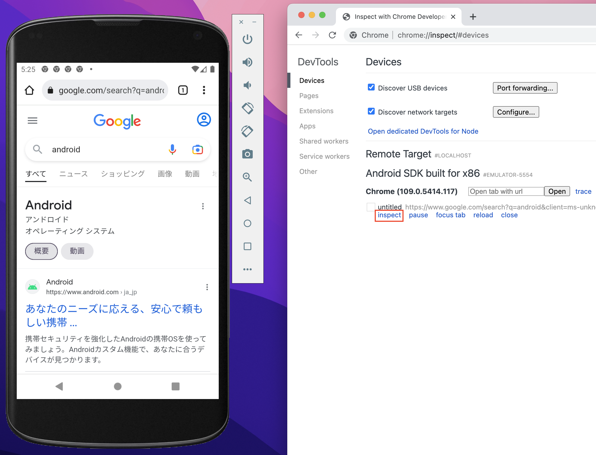 対象端末のデバッグしたい画面のinspectボタンを押下する