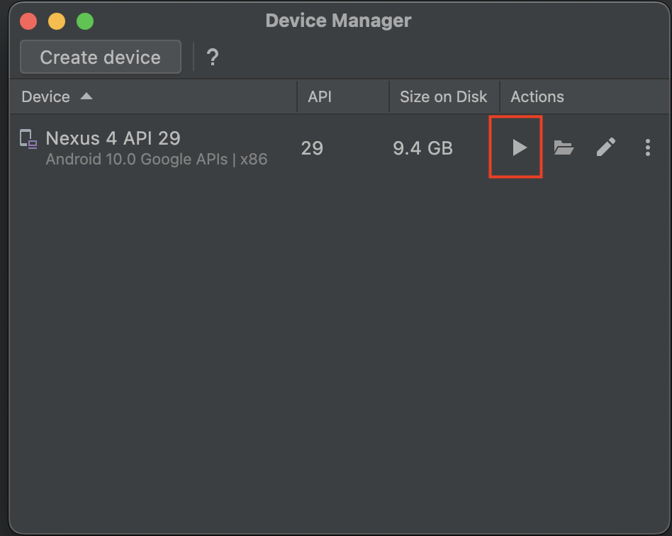 - Device Managerで再生ボタンを押下する(シミュレーター起動)