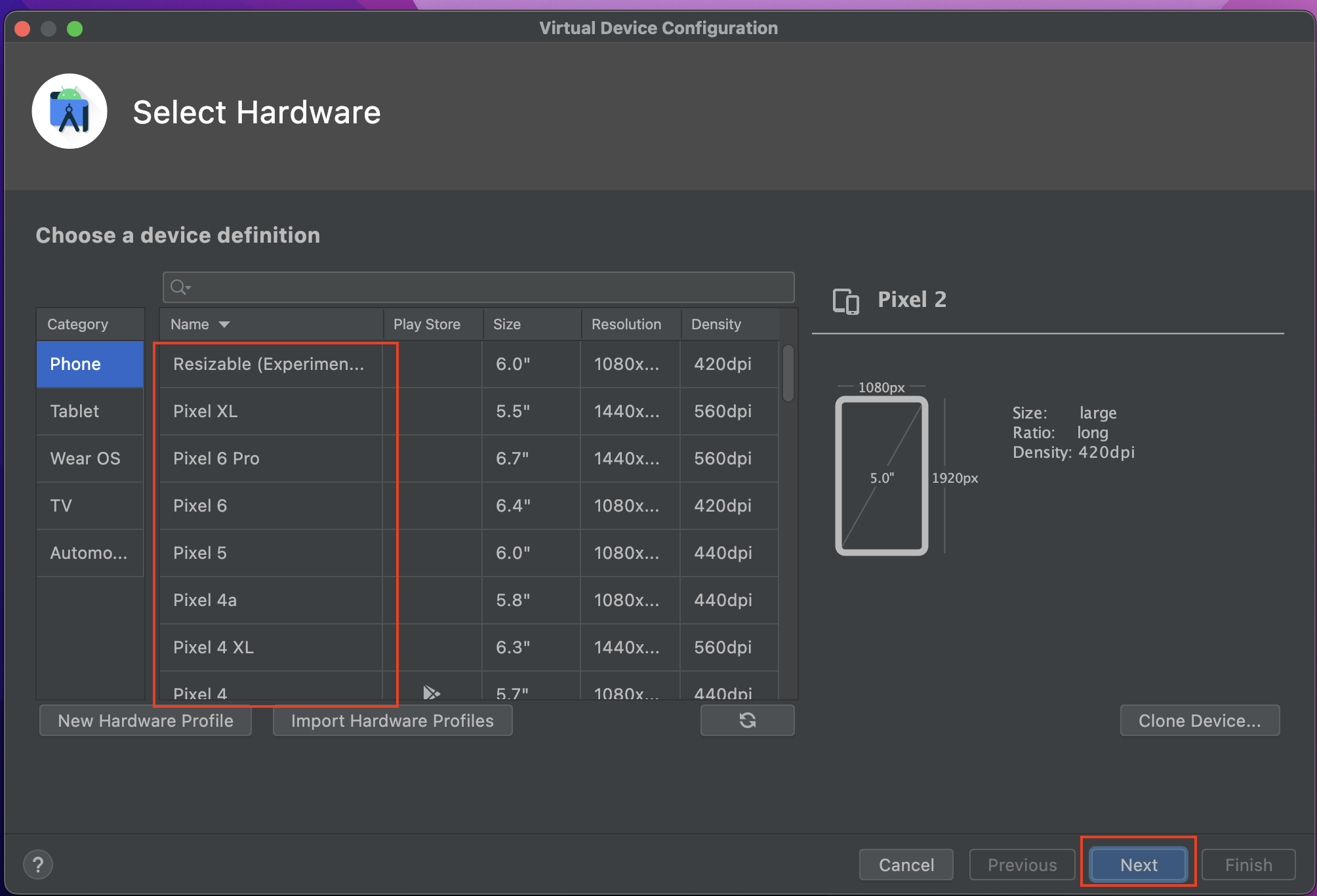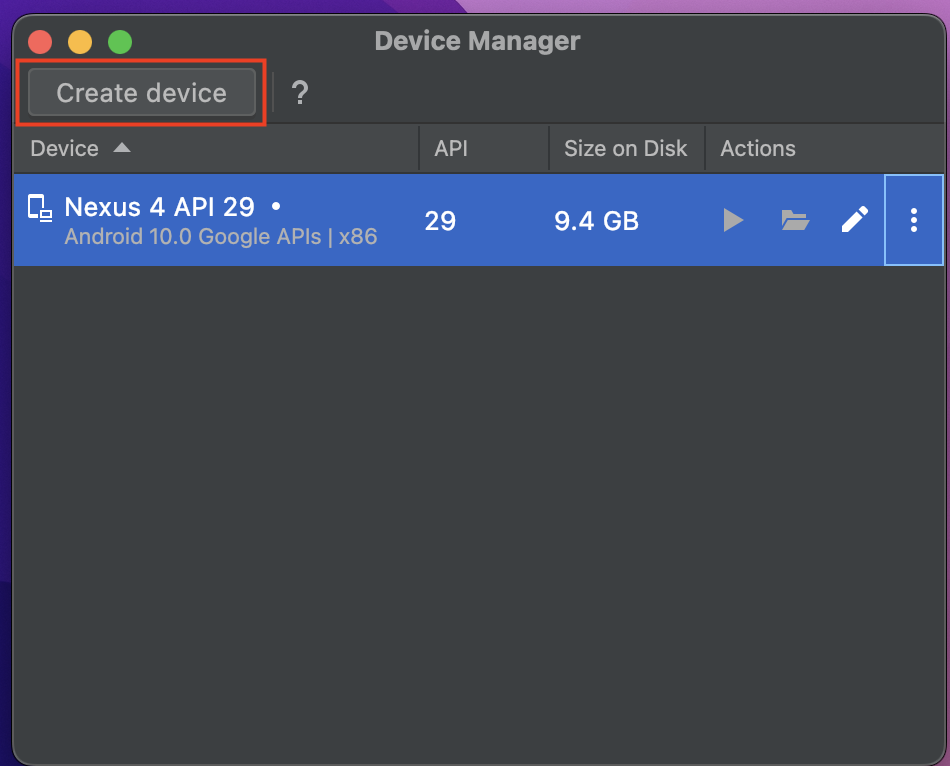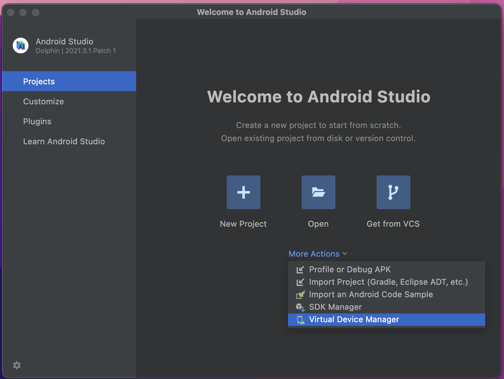 - Projects > More Actions > Virtual Device Managerを開く