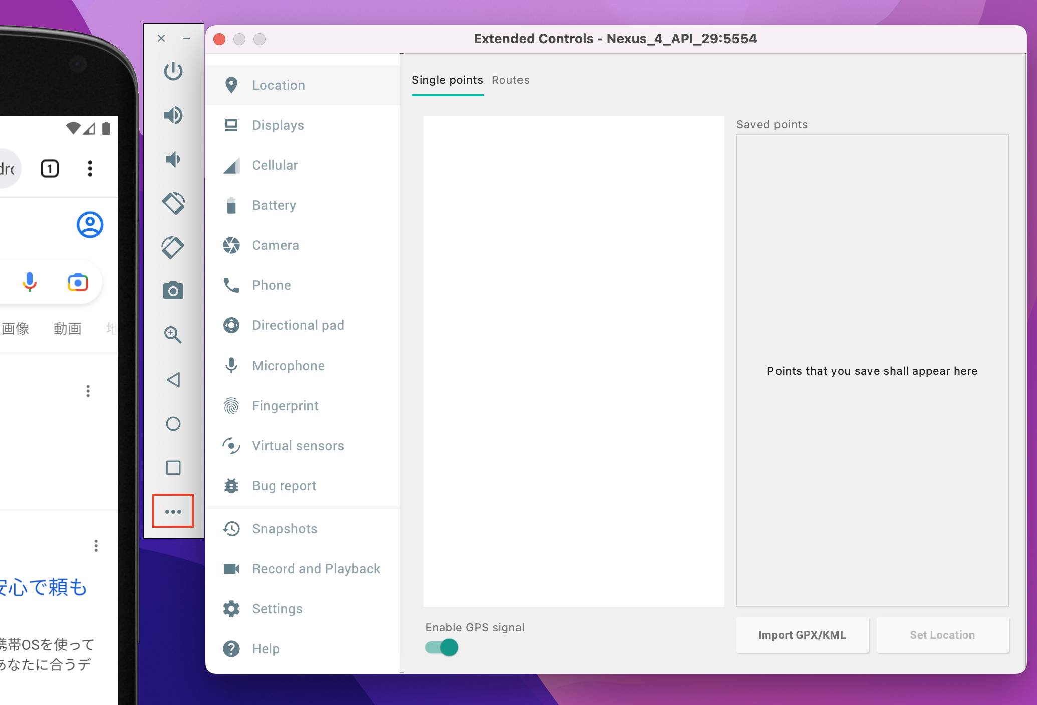 - 端末シミュレーター起動状態で、サイドバーのExtensions Controlsを開く(3点リーダー)