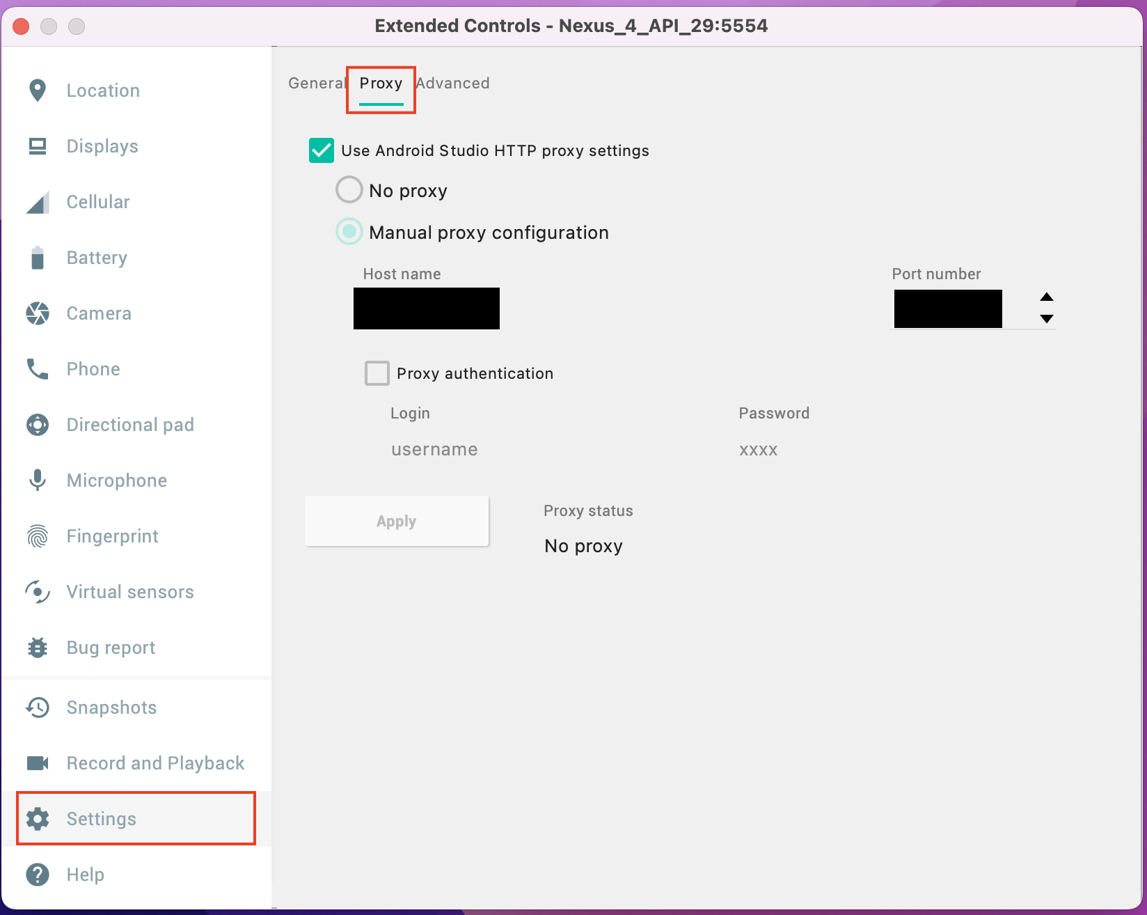 - Settingを開き、Proxyタブを選択する